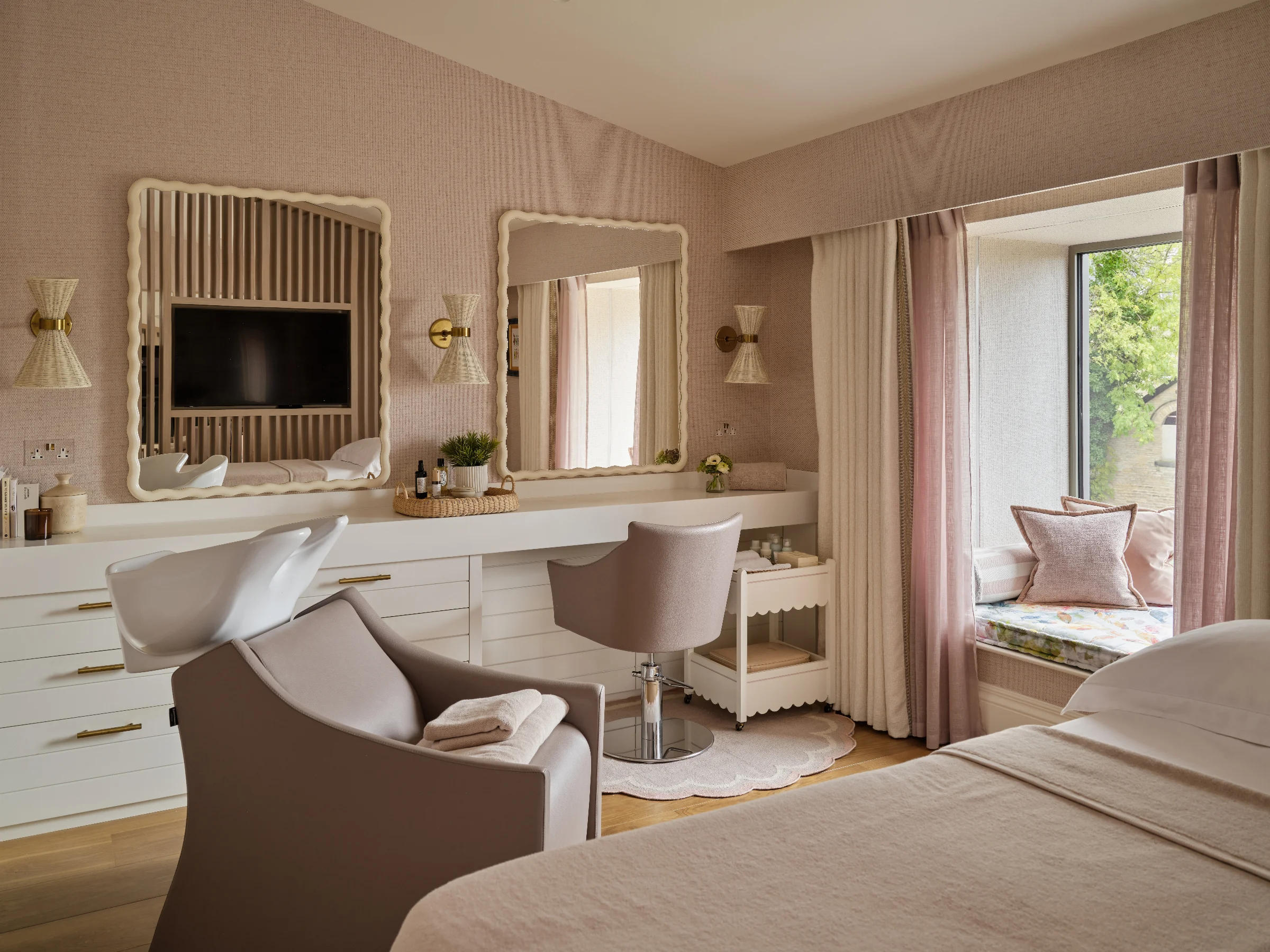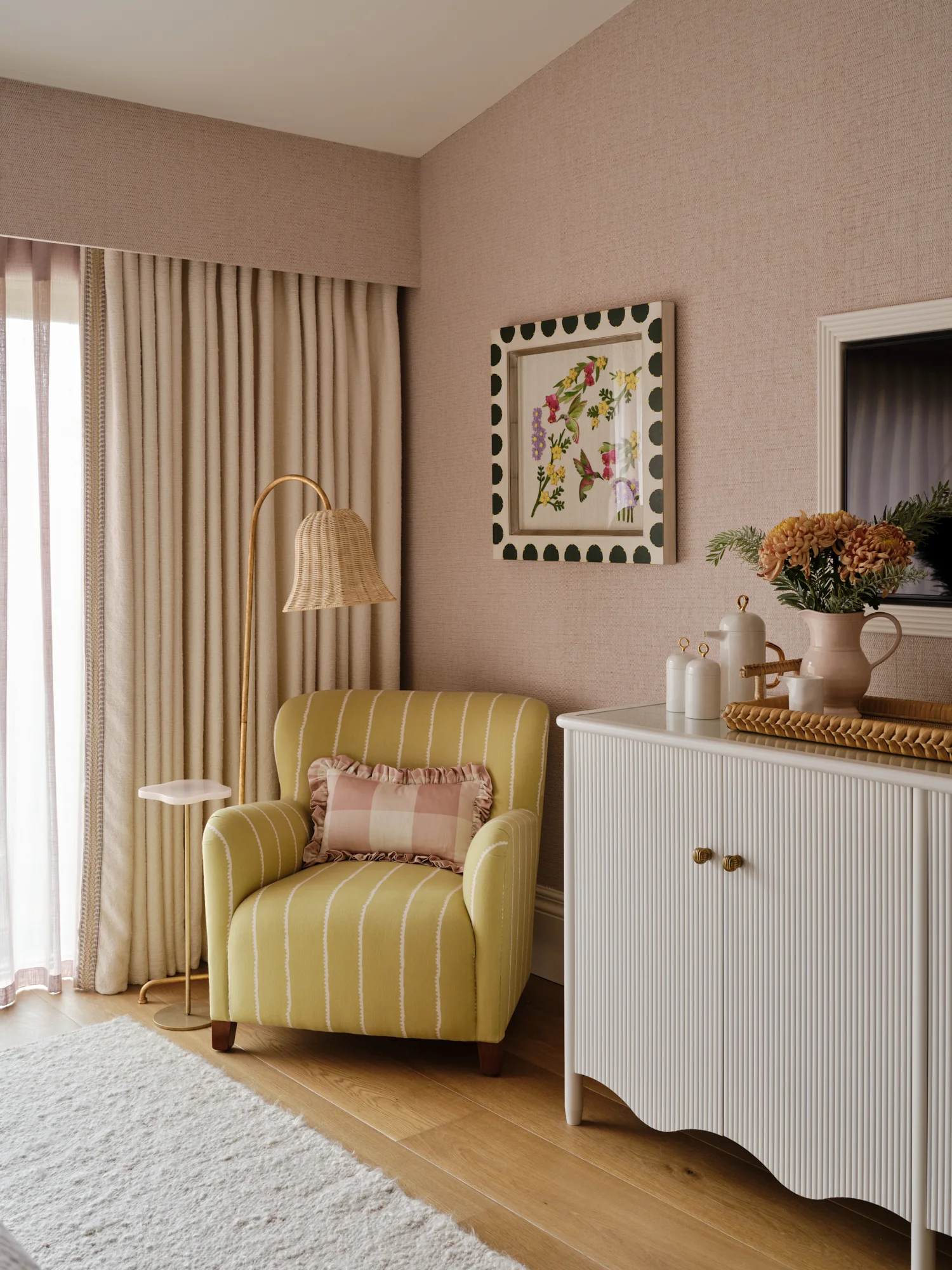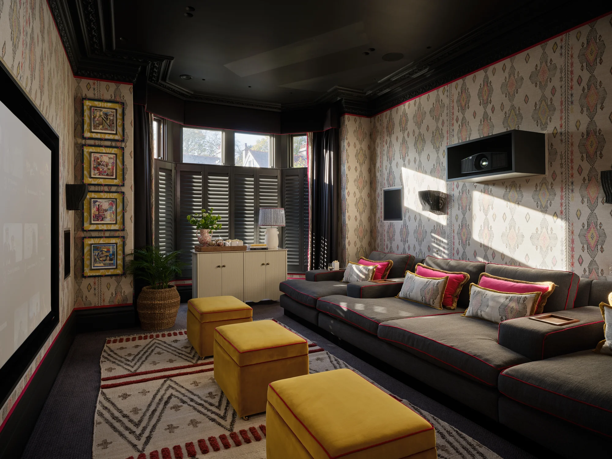 As well as honouring the period feel of the house, we also had to sensitively integrate a ‘wish list’ for the house which very much reflected modern day living. Departing from the classic cinema room style of plain, dark and moody, we chose padded fabric walling in a striking pattern to add personality and texture whilst also having great acoustic properties.