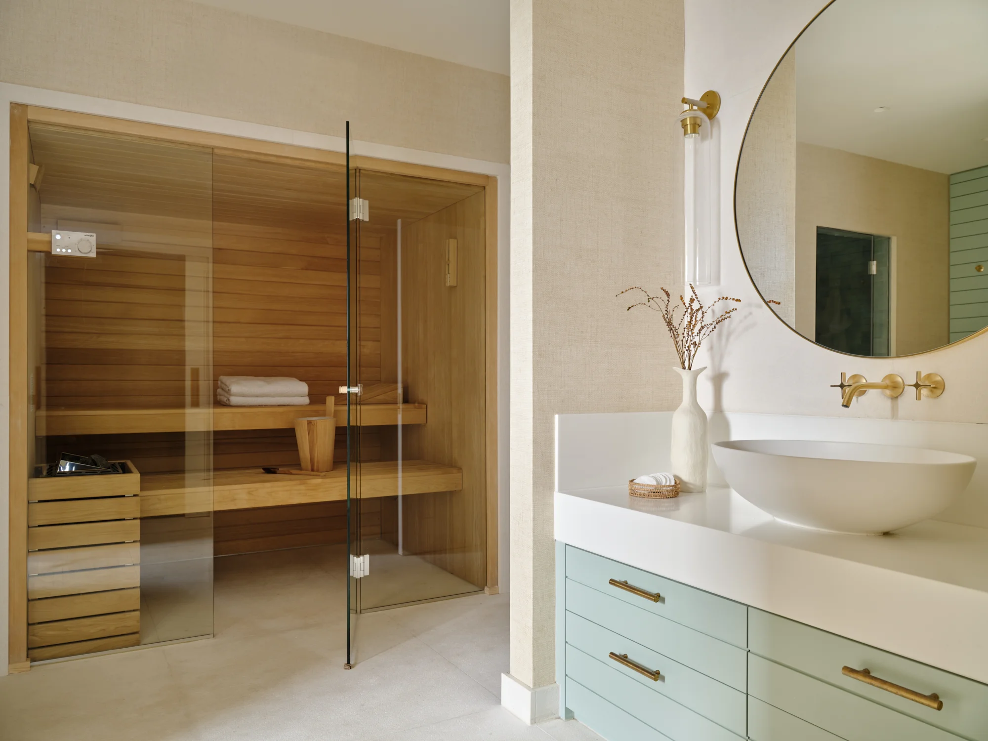 The master suite brings wellness within the home to a new level with its spa bathroom with sauna and steam rooms, gym and treatment room where manicures, hair dressing, acupuncture and massage takes place.